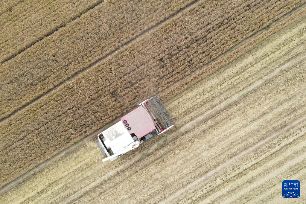 6月5日,联合收割机在河北省沙河市下郑村收割小麦(无人机照片)。