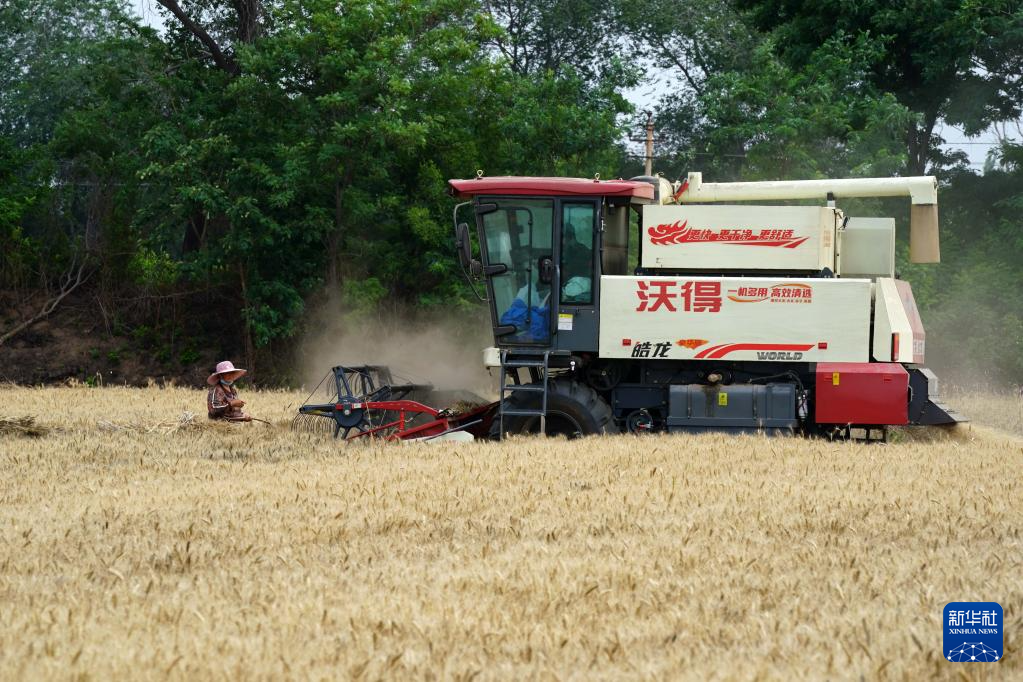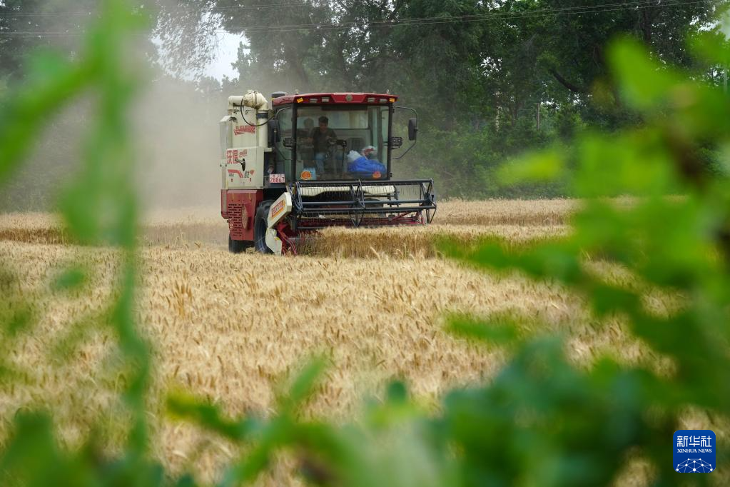 6月5日,联合收割机在河北省沙河市下郑村收割小麦。