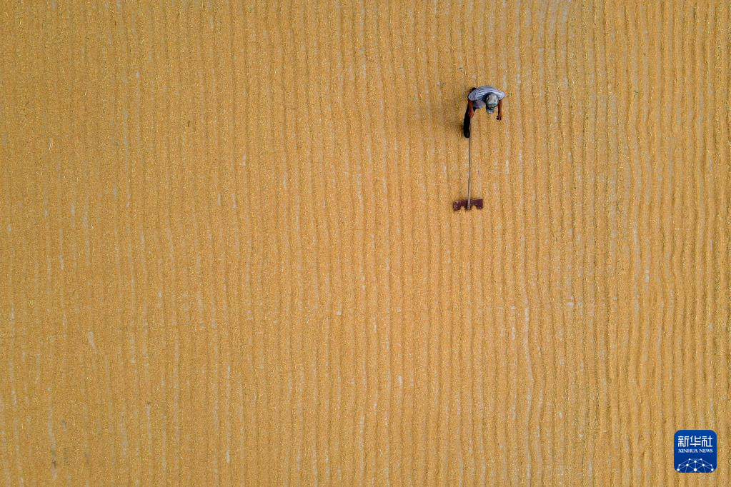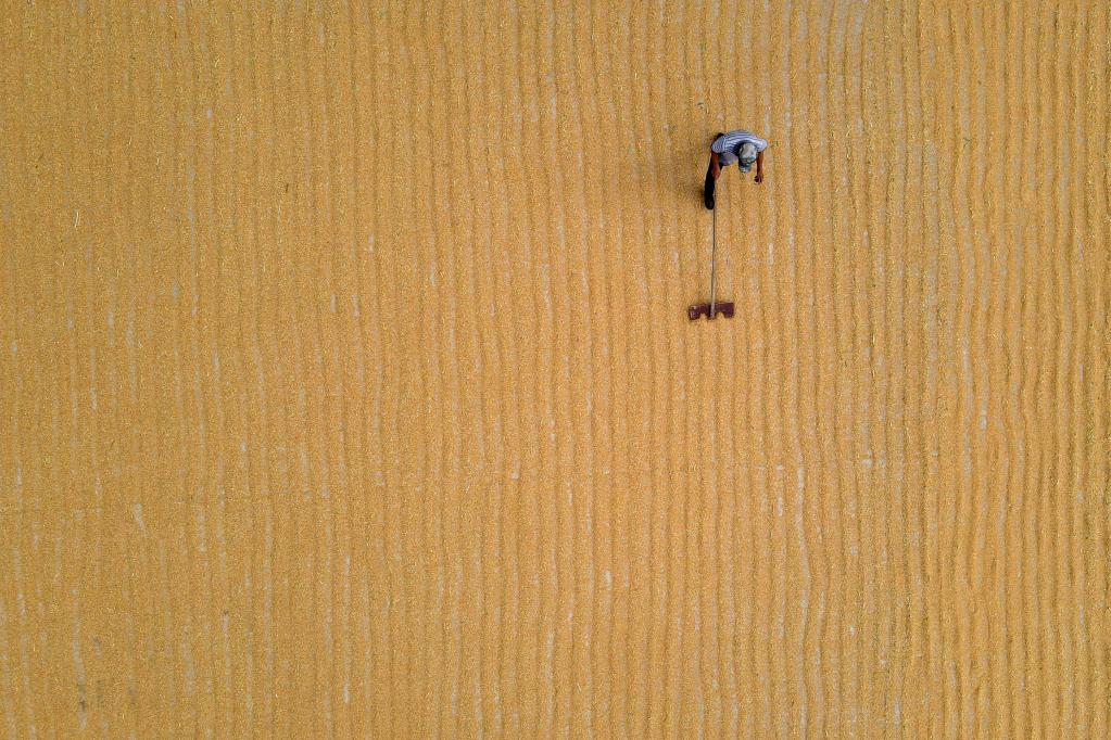 6月5日,河北省沙河市赞善村农民在晾晒收获的小麦(无人机照片)。