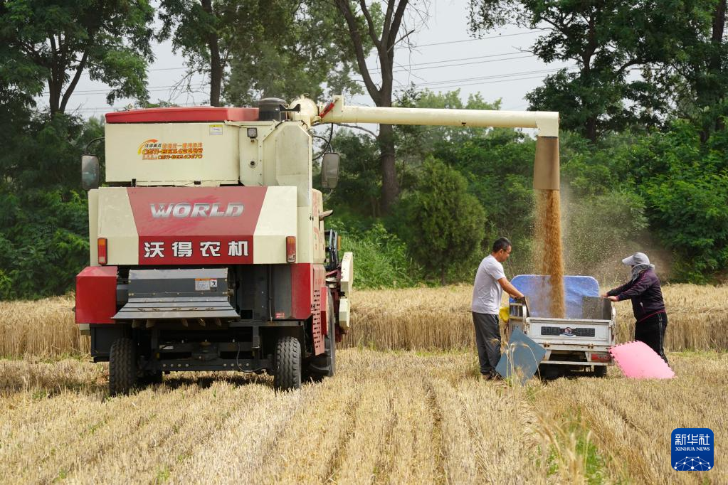 6月5日,农民在河北省沙河市下郑村的麦田里将收获的小麦装车。