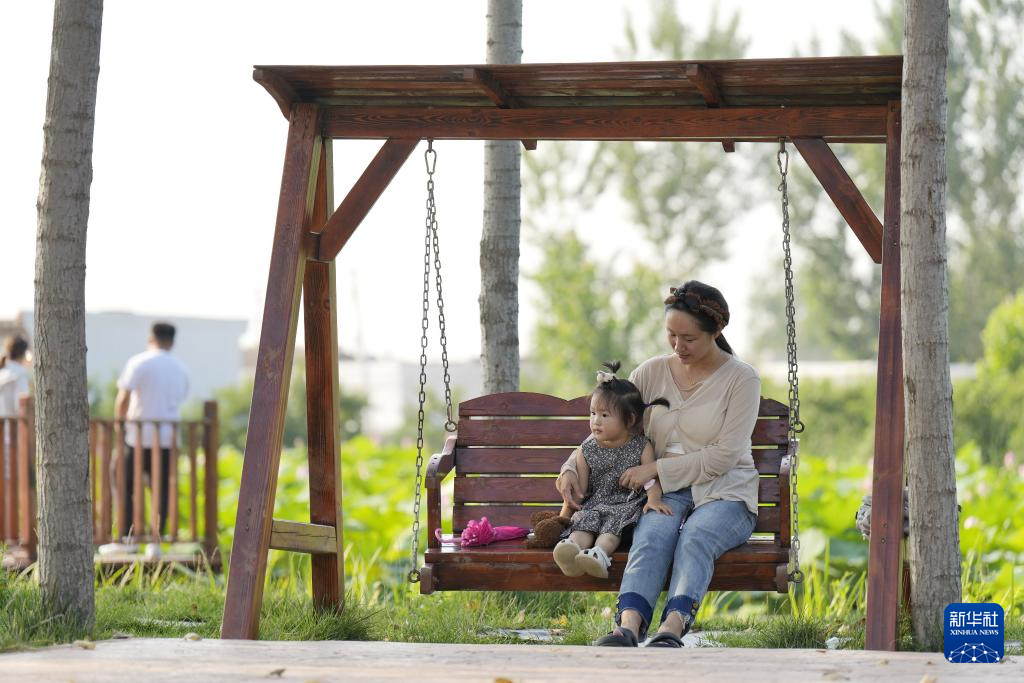 7月19日,村民在河北省唐山市丰南区北孙庄村一处水上游园内休闲。