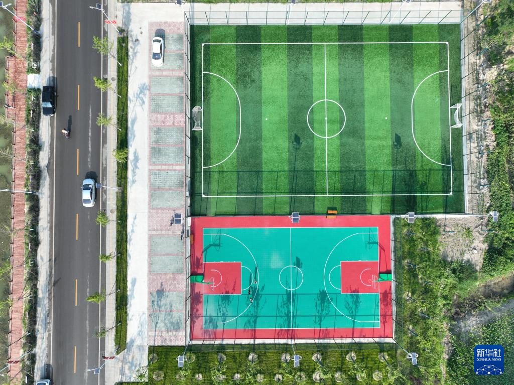河北省唐山市丰南区赵新庄村内新建的足球场和篮球场(7月19日摄,无人机照片)。