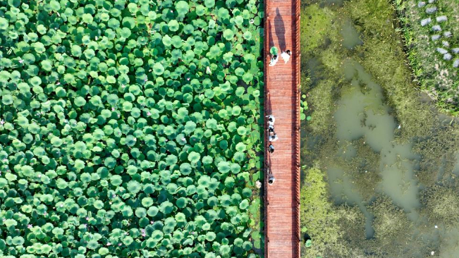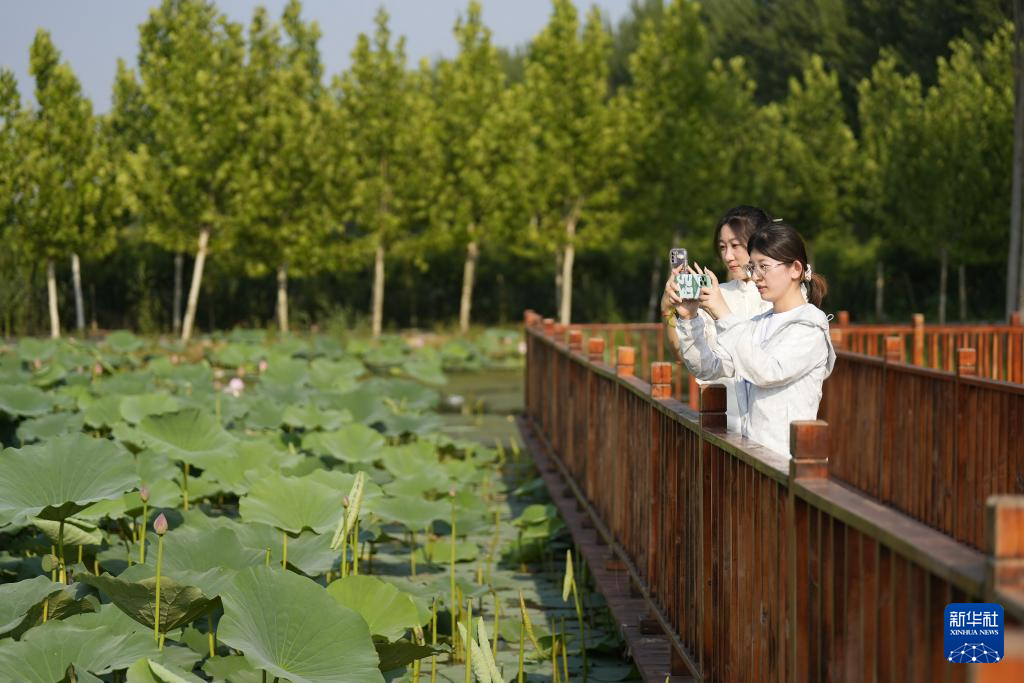 7月19日,游客在河北省唐山市丰南区北孙庄村一处水上游园内拍摄荷塘。