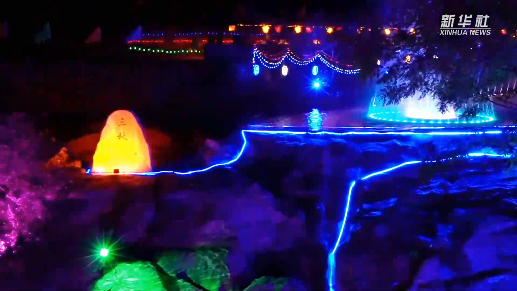 夜幕降临,河北省阜平县东台村“水上乐园”呈现出一派热闹景象,灯光秀、音乐喷泉、文艺演出等活动丰富多彩,吸引众多居民和游客前来打卡游玩。
