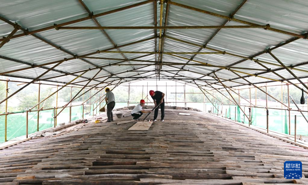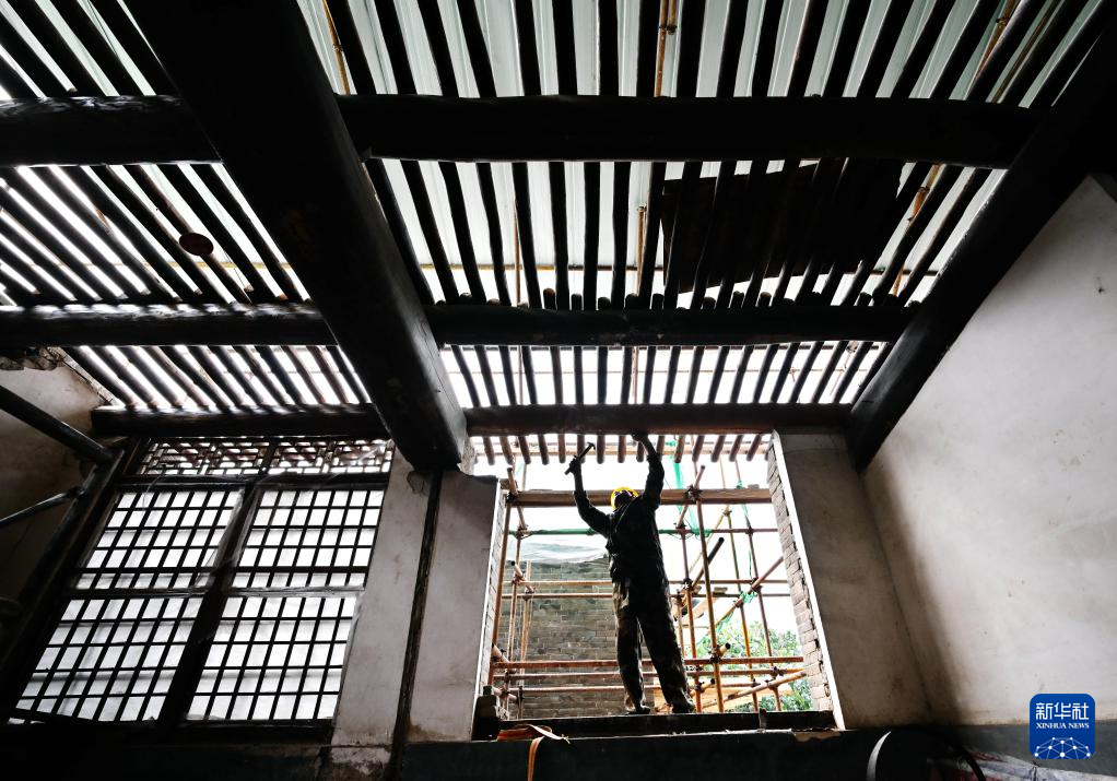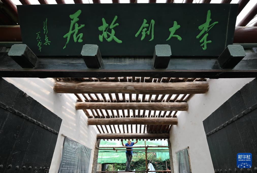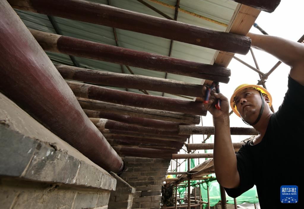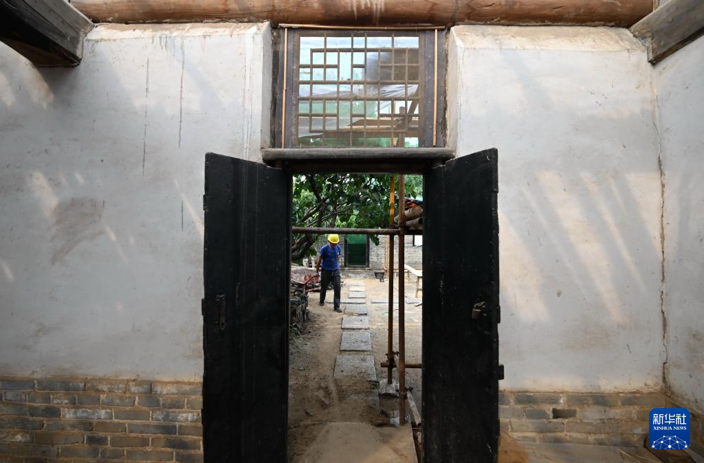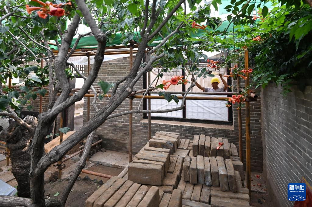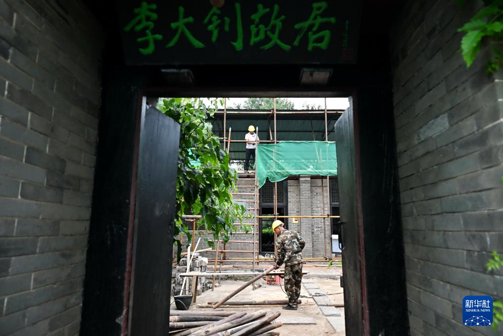 8月29日,工人在李大钊故居维修保护工程工地施工。