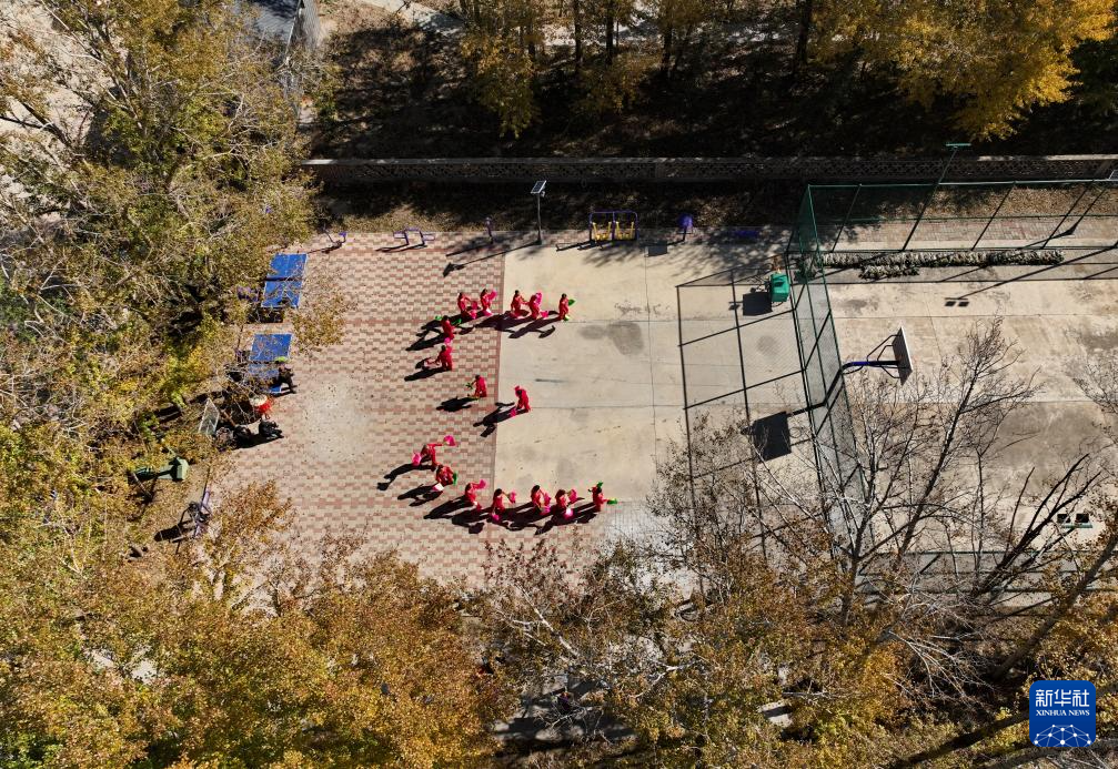老人们在河北省康保县土城子镇互助幸福院内跳舞(10月14日摄,无人机照片)。