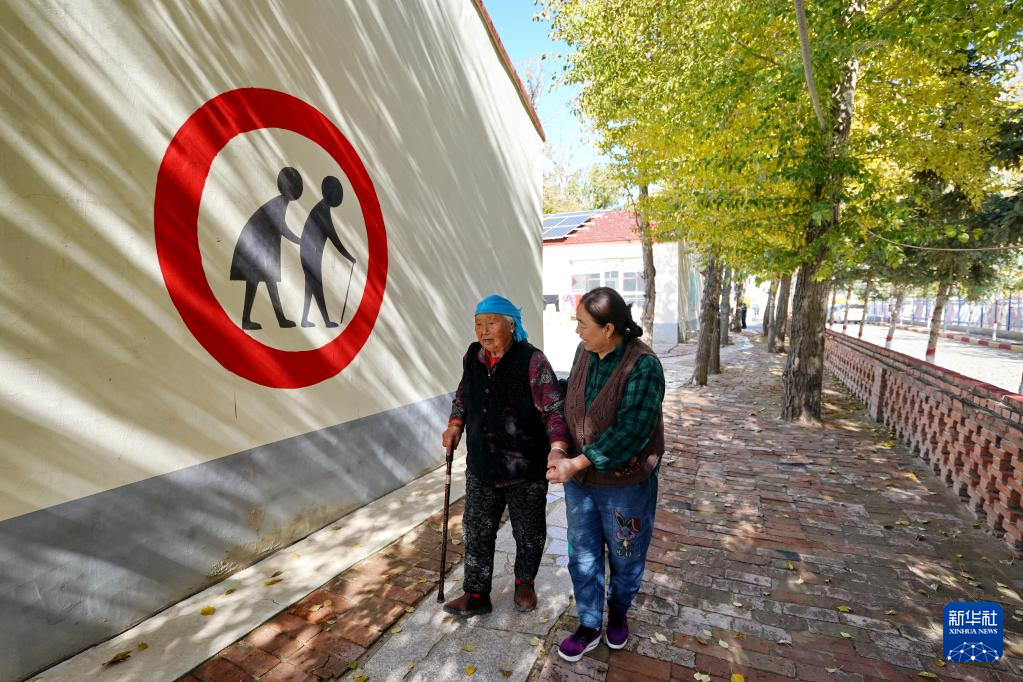 10月14日,居住在河北省康保县土城子镇互助幸福院的老人在院子里行走。