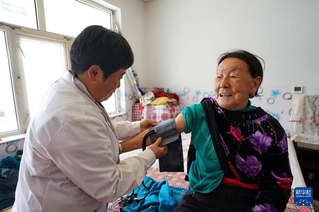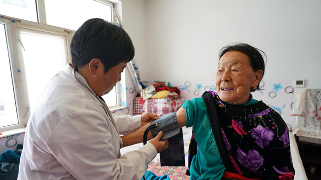 10月14日,医护人员在河北省康保县土城子镇互助幸福院内为老人量血压。