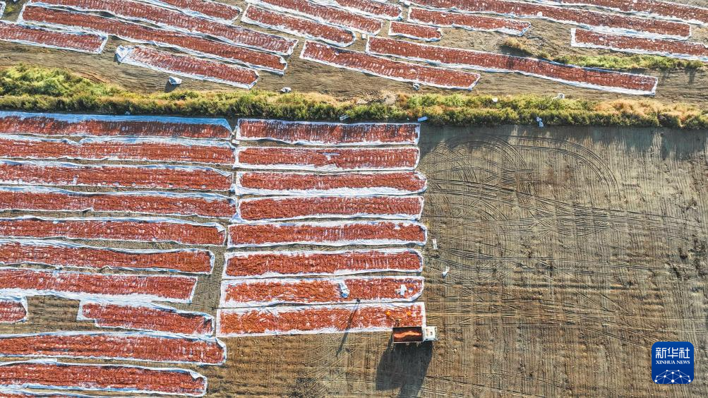 10月18日,河北省唐山市迁西县罗家屯镇西寨村农民在整理辣椒(无人机照片)。