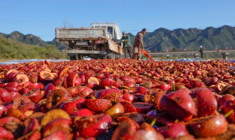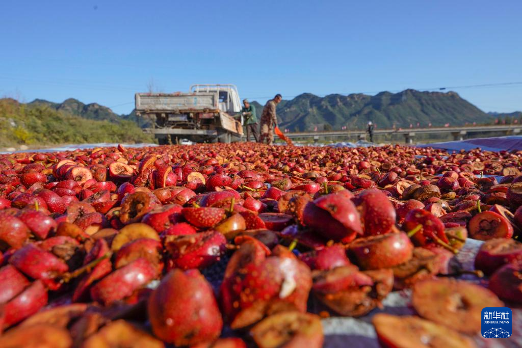 10月18日,农民在河北省遵化市一家果品专业合作社晒场晾晒山楂干。