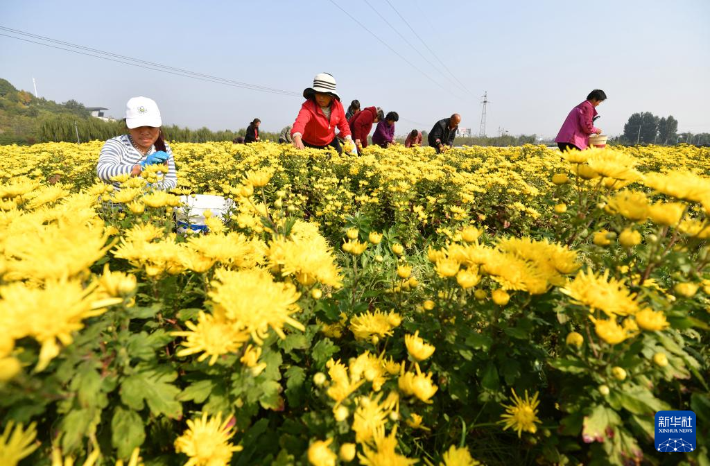 10月17日,河北省石家庄市平山县北红岸寨村农民在田里采摘菊花。