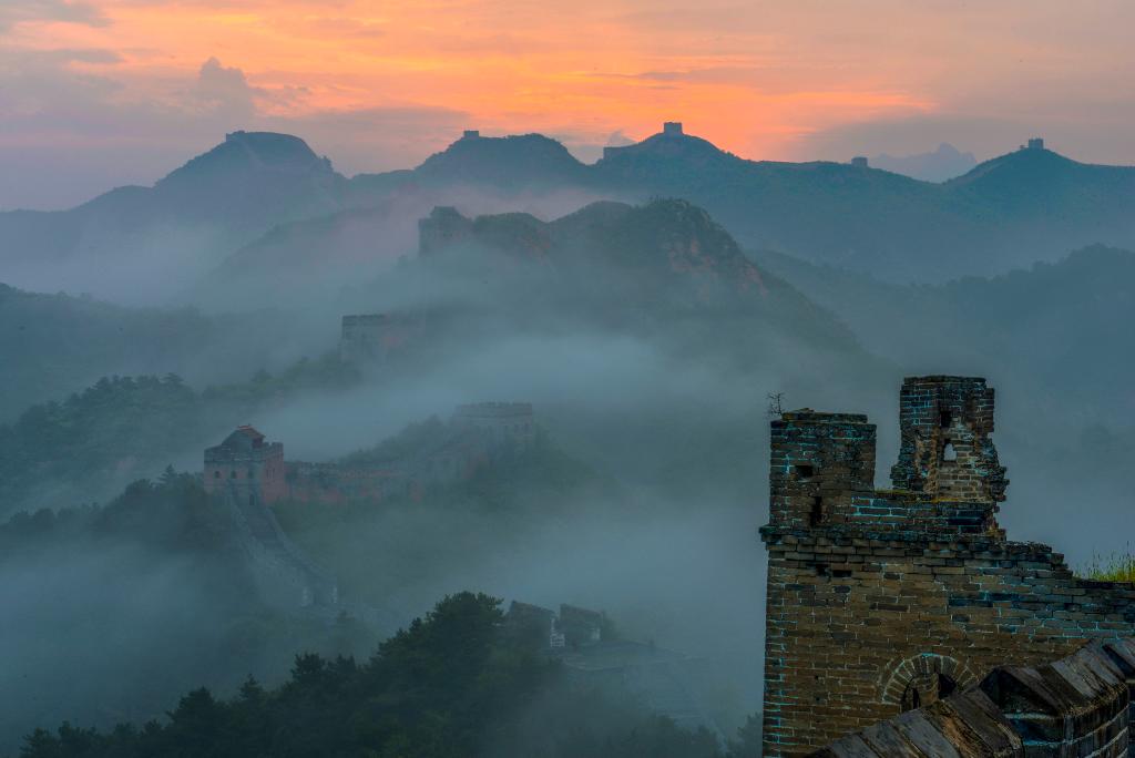 金山岭长城的夏天充满生机,树木葱郁,凉风习习。降雨过后,金山岭长城的温度和湿度有一定几率形成云海。在一个雨后的清晨,天蒙蒙亮,我站在家门口,看到山谷里的水蒸气化作雾气向空中升起。我背起相机,在天空刚刚露出鱼肚白时到达合适的拍摄位置。古朴的金山岭长城在碧绿的山间若隐若现,像一条巨龙横卧在崇山峻岭之上。云海翻腾,在金山岭长城与山间游动,蔚为壮观。