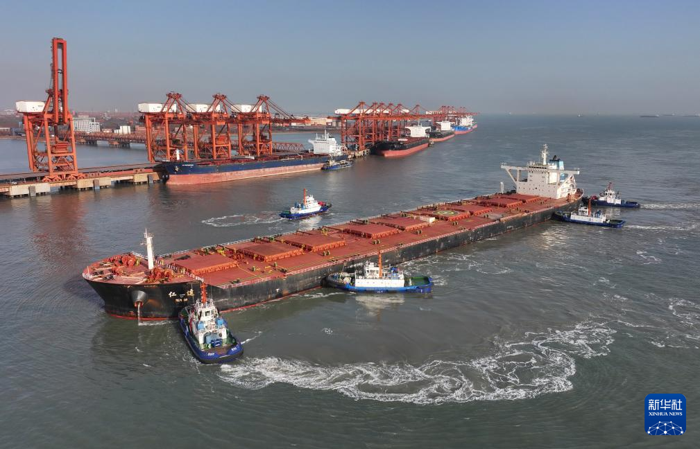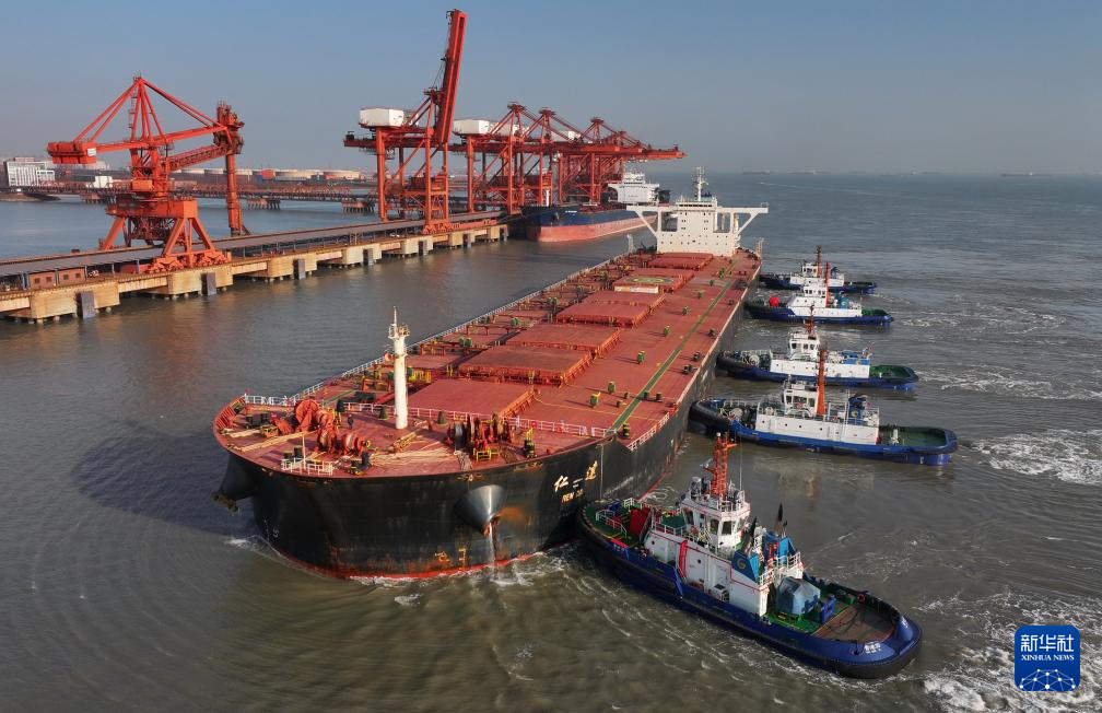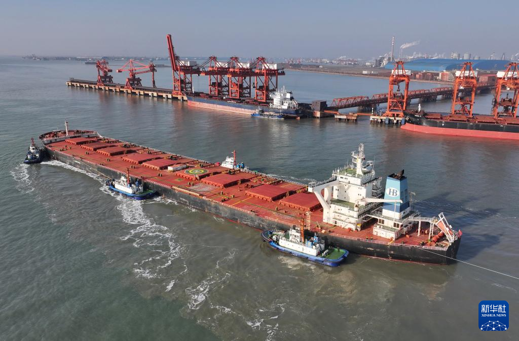 1月12日,一艘轮船在拖轮的协助下向唐山港曹妃甸港区矿石码头靠泊(无人机照片)。