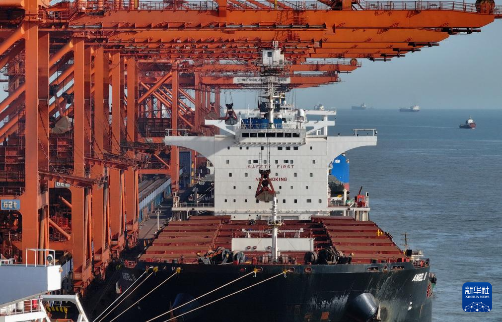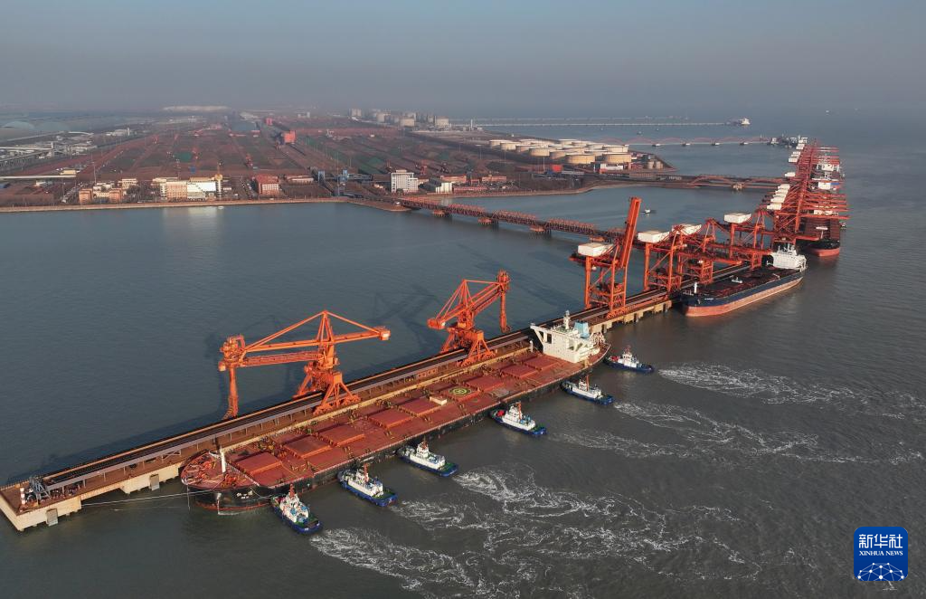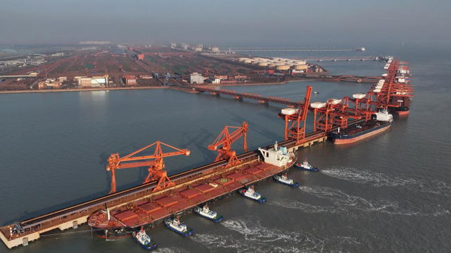1月12日,一艘轮船靠泊在唐山港曹妃甸港区矿石码头卸载(无人机照片)。