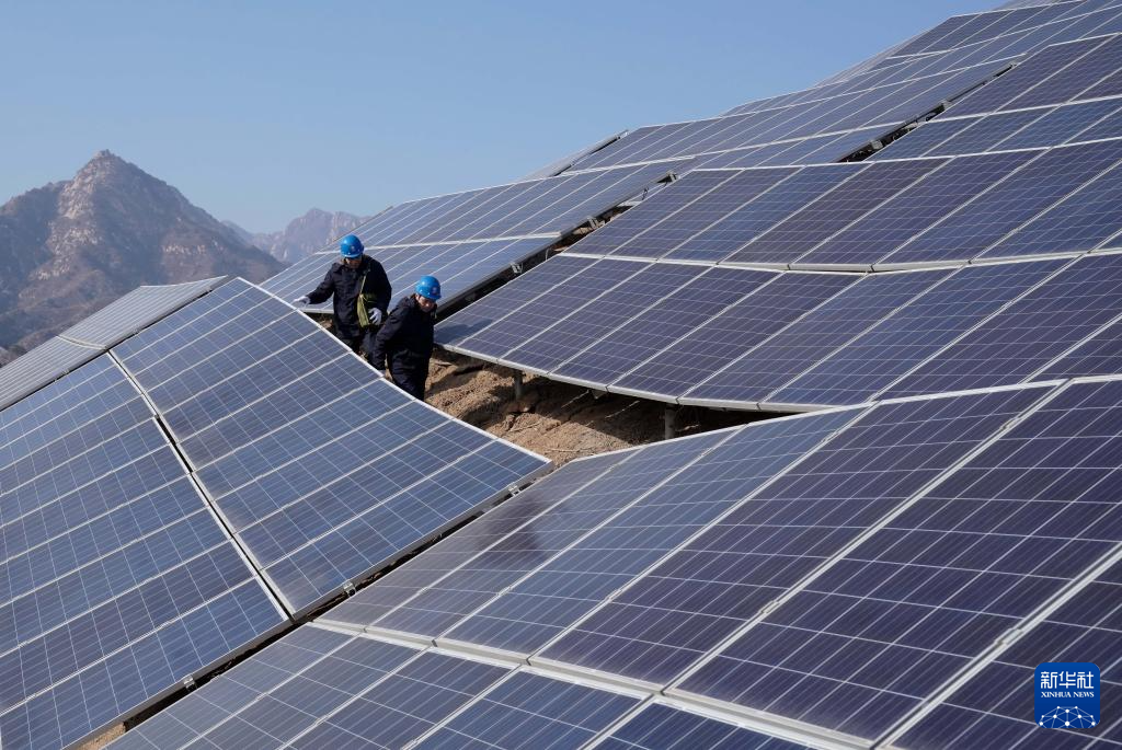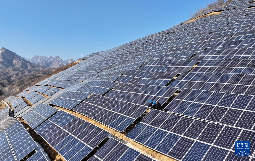 1月14日,国网石家庄供电公司的工人在石家庄市平山县营里乡桃园村附近荒山上的光伏发电场巡查。