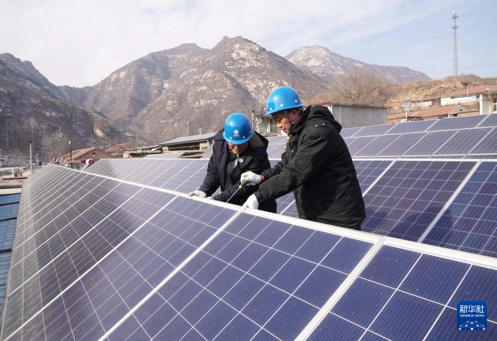 1月14日,国网石家庄供电公司的工人在石家庄市平山县小觉镇检修一农户房屋顶上的光伏发电板。