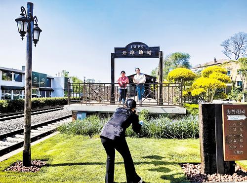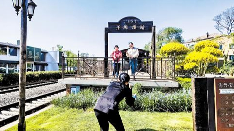 5月11日,以碧海蓝天为背景,在黑色枕木搭建的写有“1899开埠地站”的火车站牌前,几位来自北京的游客兴高采烈地拍照留念。