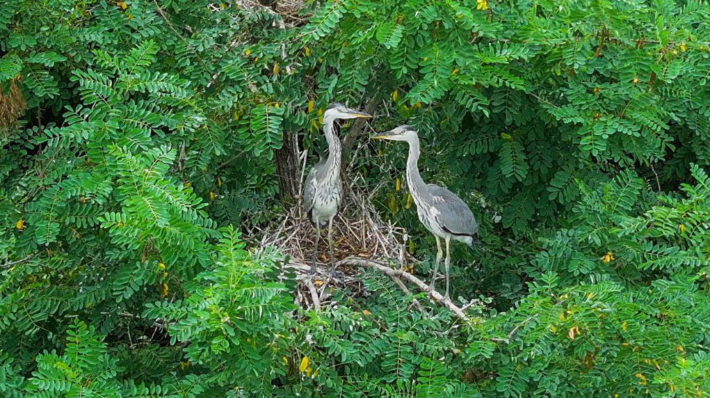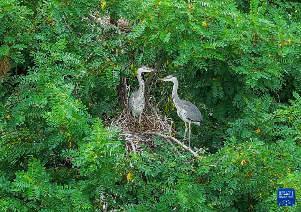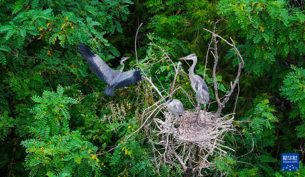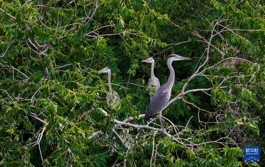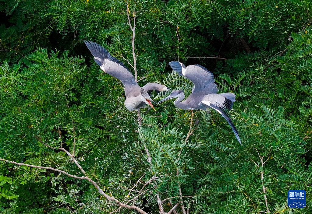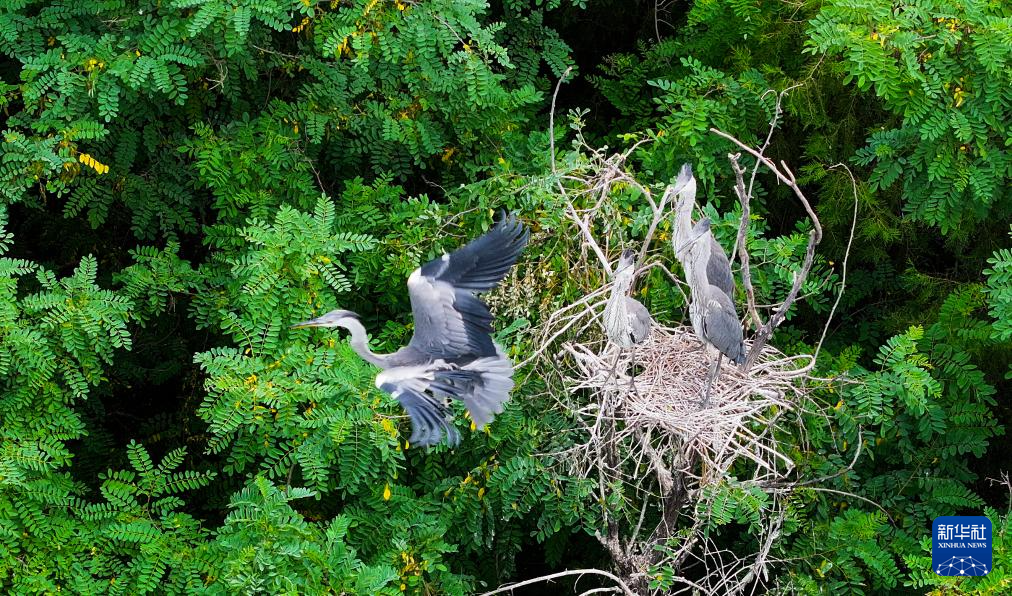 夏日里,河北省秦皇岛市桃林口水库附近的树林郁郁葱葱,一群苍鹭在林中飞舞、栖息,形成了一道靓丽风景,令人陶醉。