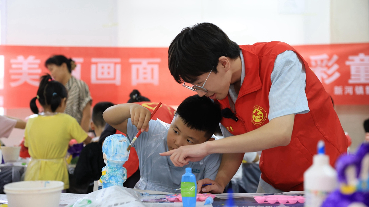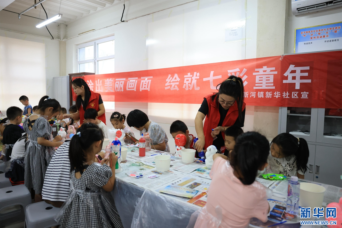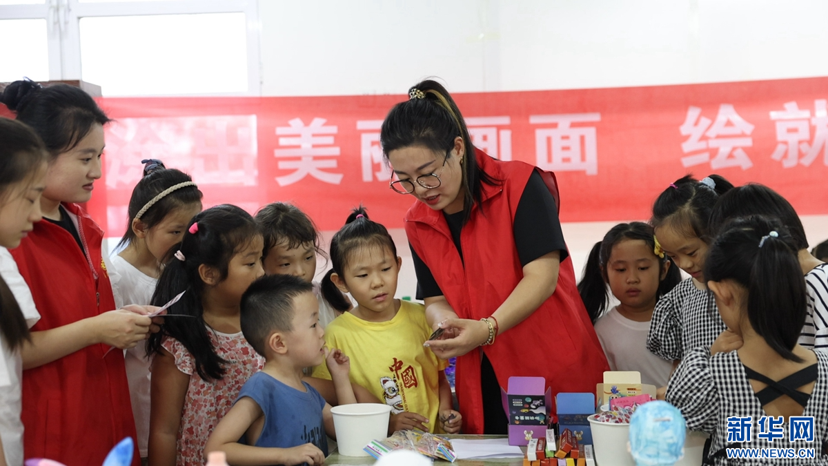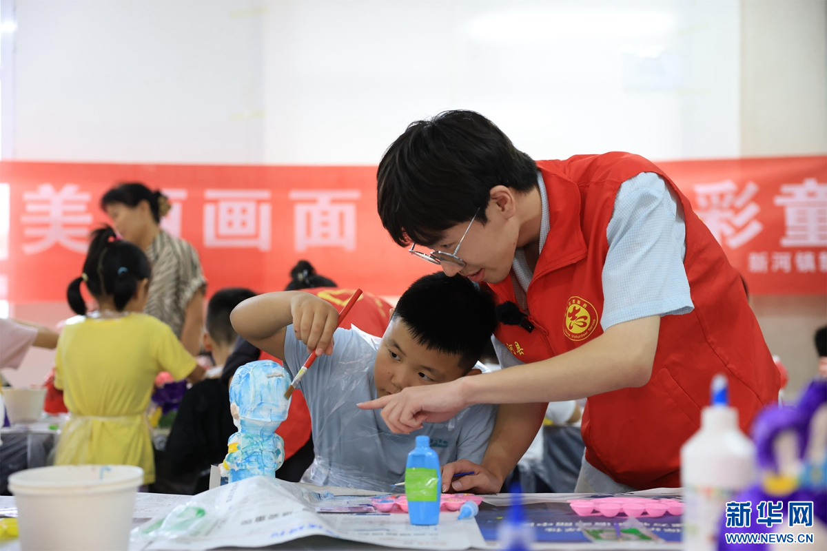大学生志愿者教孩子们做石膏彩绘。新华网发 李世强 摄