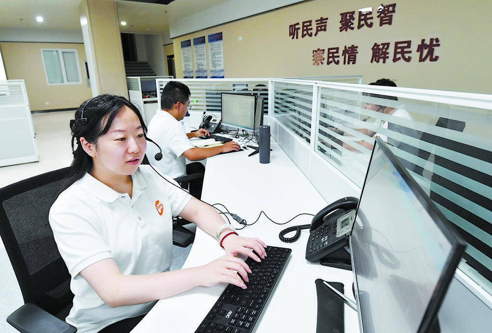 在石家庄12345热线话务服务大厅,墙面上“把群众呼声作为第一信号,把群众满意作为第一标准”的标语非常醒目,大厅入口处电子信息屏幕实时滚动显示热线数据统计和模块分析,话务员坐在各自工位上,佩戴耳机,用专业有温度的声音接通一个个来电。“您好,这里是石家庄12345热线,请问有什么可以帮您?……”