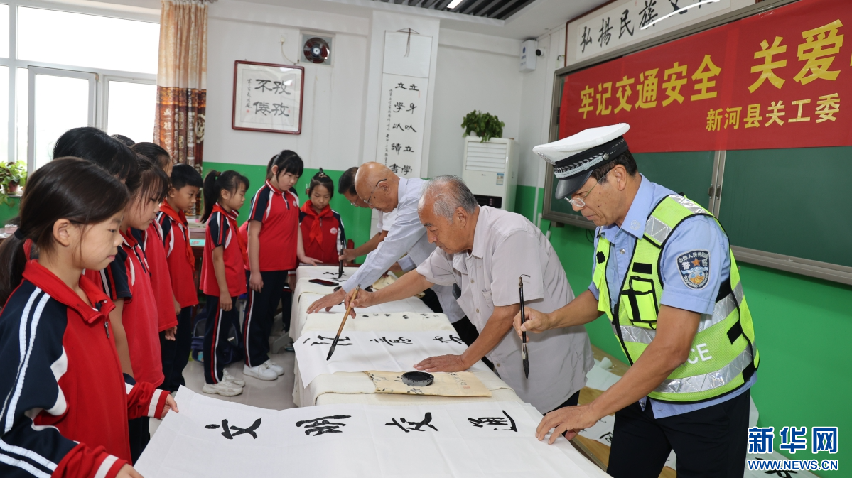 民警和书法爱好者通过交通安全书法作品倡导文明出行。新华网发 刘莹 摄