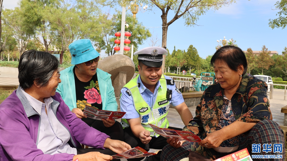 民警向社区居民发放《交通安全30诀》宣传彩页。新华网发 刘莹 摄