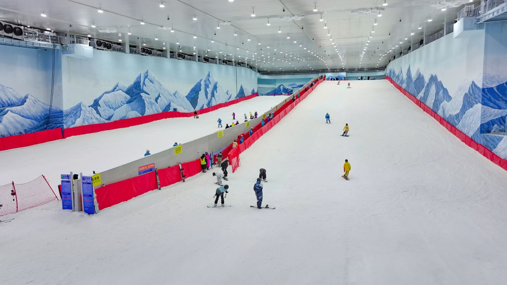 ↑9月25日,游客在鲲乐湾国际旅游度假区冰雪世界滑雪。(李延涛 摄)