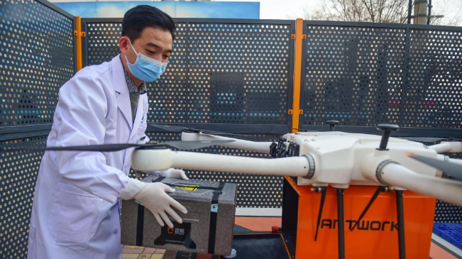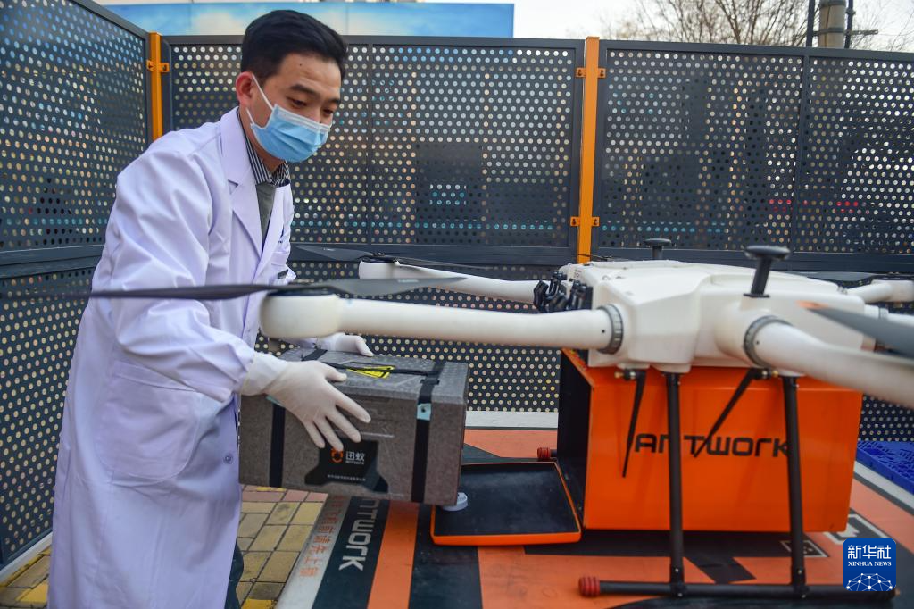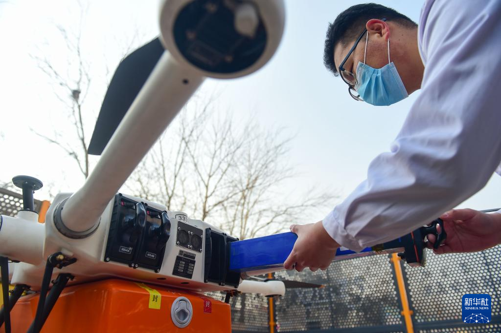 1月21日,沧州中西医结合医院实验诊断科的工作人员从刚降落的无人机上取下“标本转运箱”。