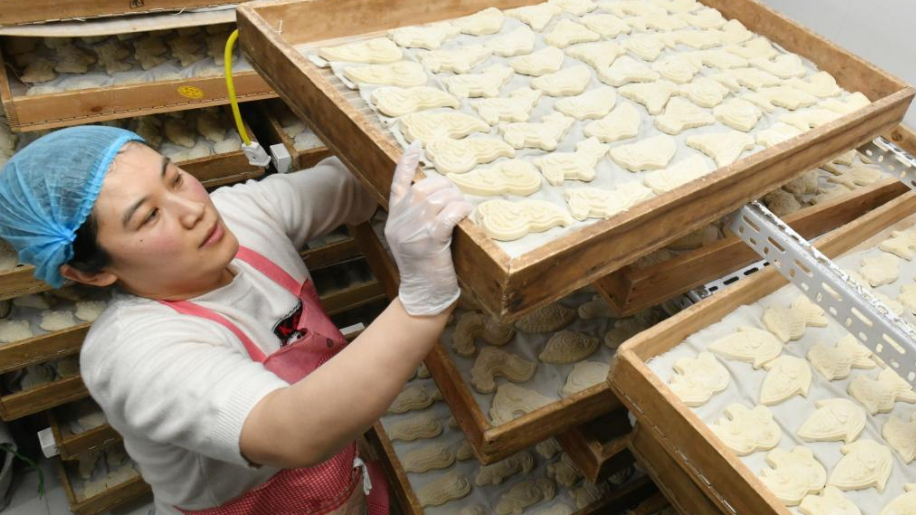 河北沧州渤海新区黄骅市有着过年蒸面花的习俗,随着春节临近,当地面花制作工厂加班加点制作面花,供应春节市场。