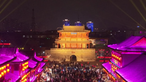 春节期间,邢州古城光影秀以清风楼为舞台,再现千年历史,吸引众多游客驻足观看。