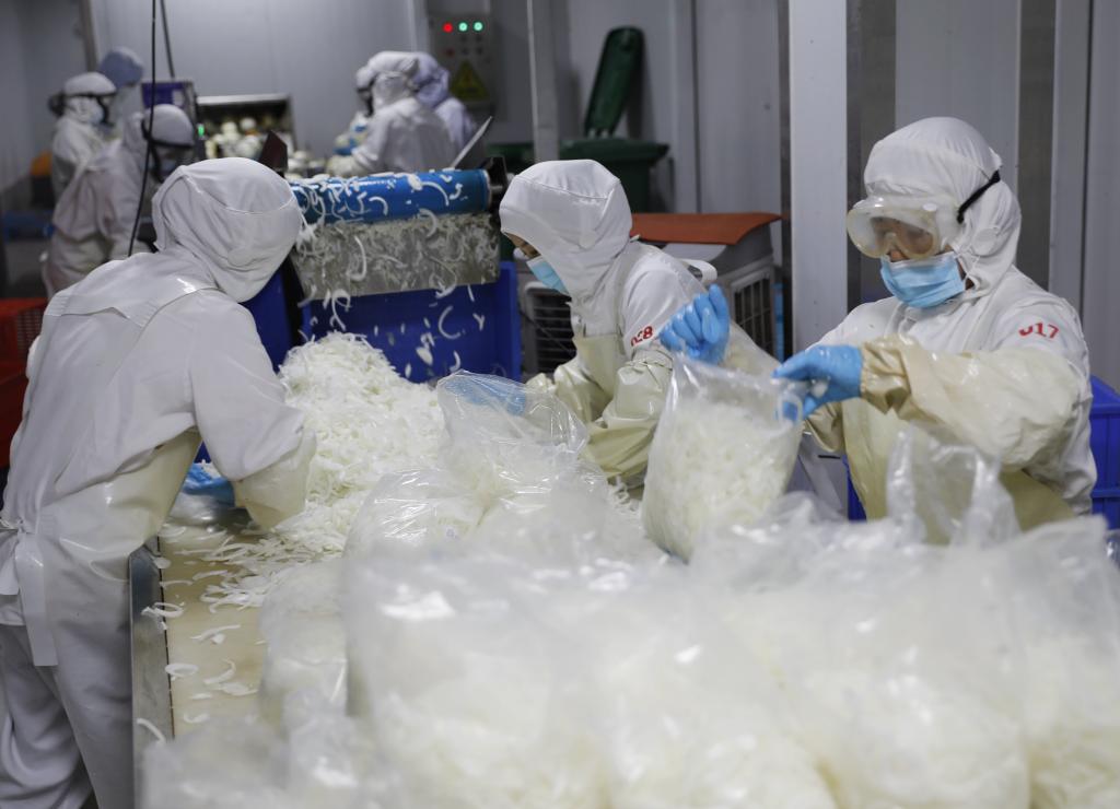 在固安县品鲜康宁食品有限公司的加工车间,工人在包装洋葱。新华社发(吴迪 摄)