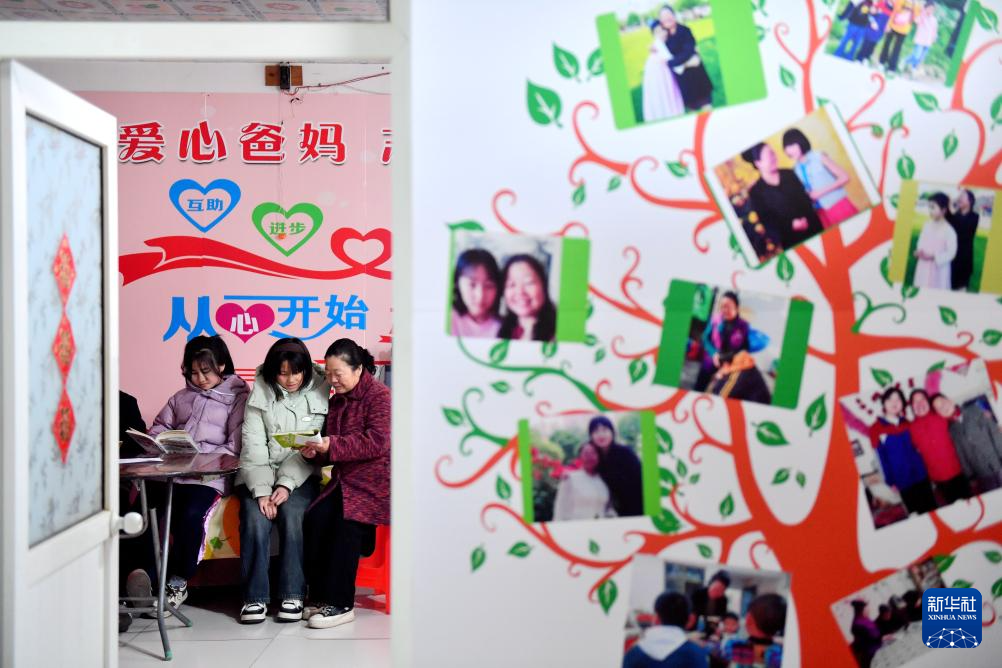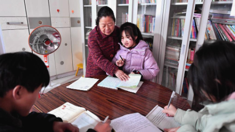 3月2日,在滏阳营村“爱心小屋”,陈玉文在辅导孩子写作业。