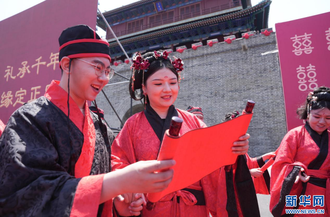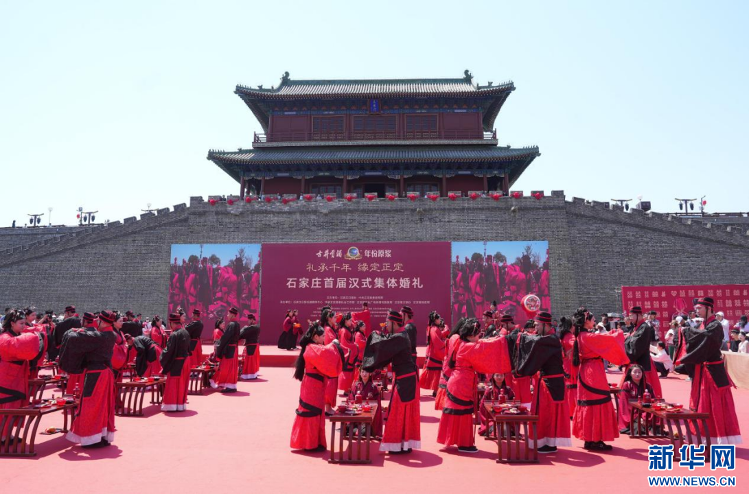 5月17日,河北省石家庄市首届汉式集体婚礼在古城正定举行。活动现场,25对身着汉式婚礼袍服的新人行对拜礼、饮合卺酒、诵婚书、传家训,再现中华传统婚典文化的古韵之美。本次活动旨在提倡节俭朴素新风尚,让广大青年树立正确的婚恋观和家庭观。
