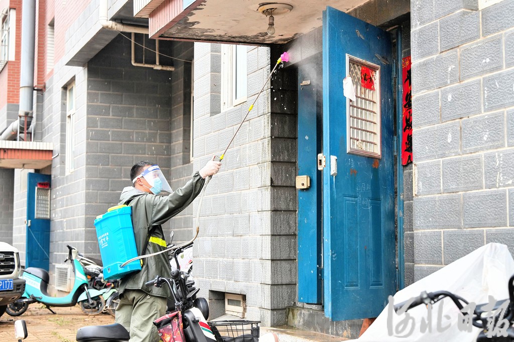 7月27日,阜平县疾病预防控制中心工作人员在世纪城小区开展消杀作业。