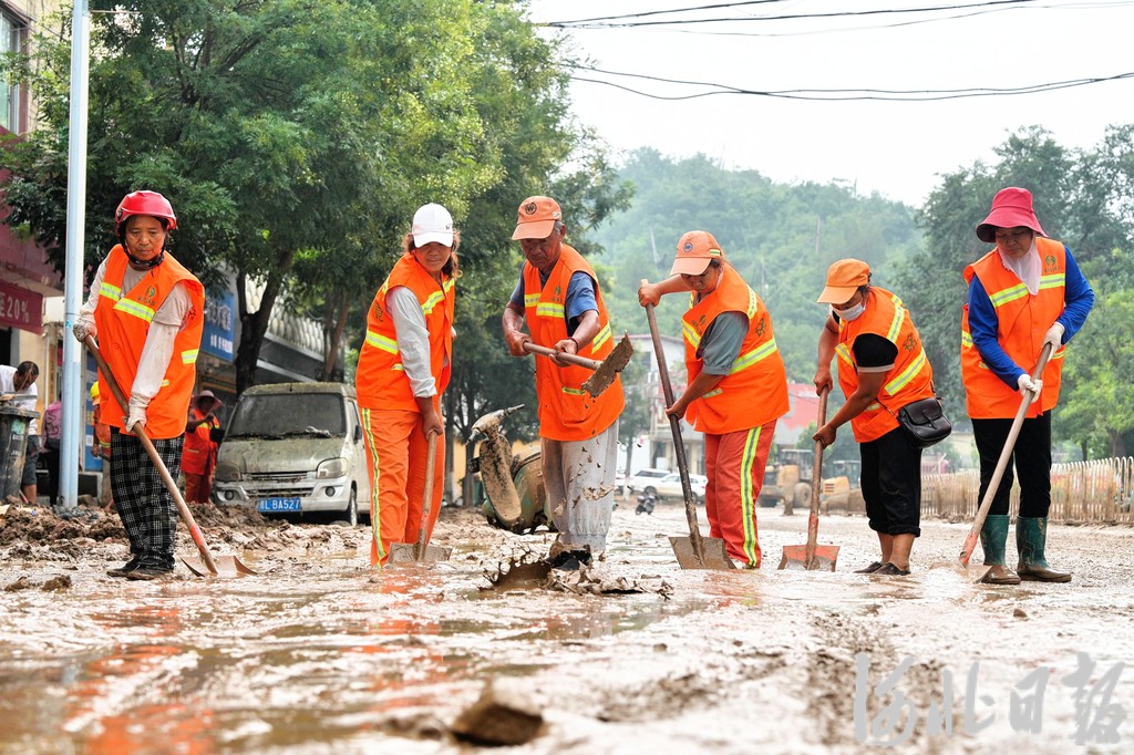 7月27日,环卫工人在阜平县城街道上清理淤泥。