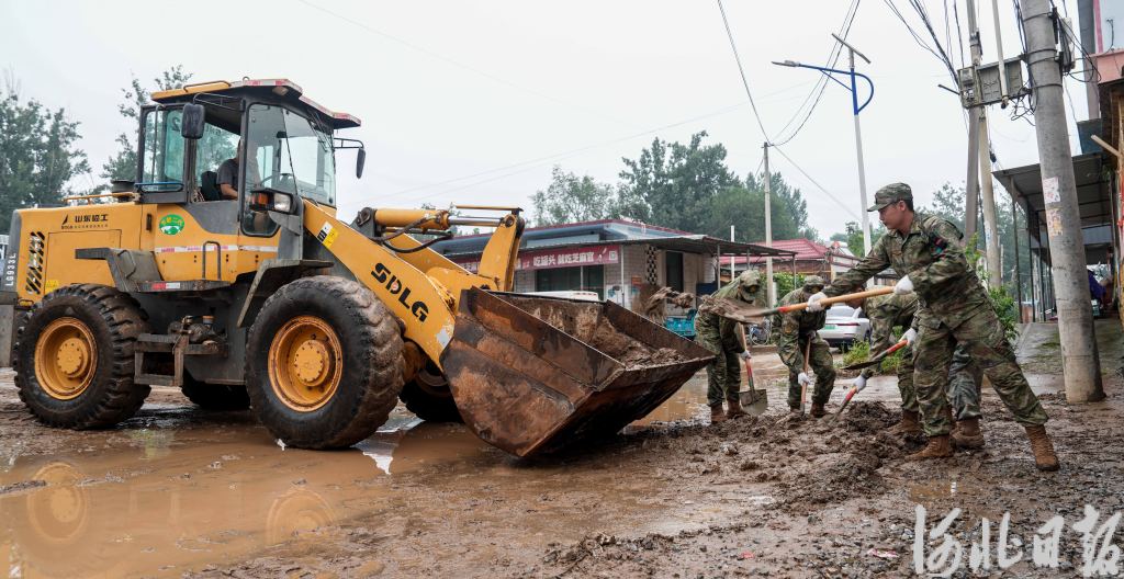 7月27日,易县人民武装部协调部队官兵到中高村清理道路淤泥。