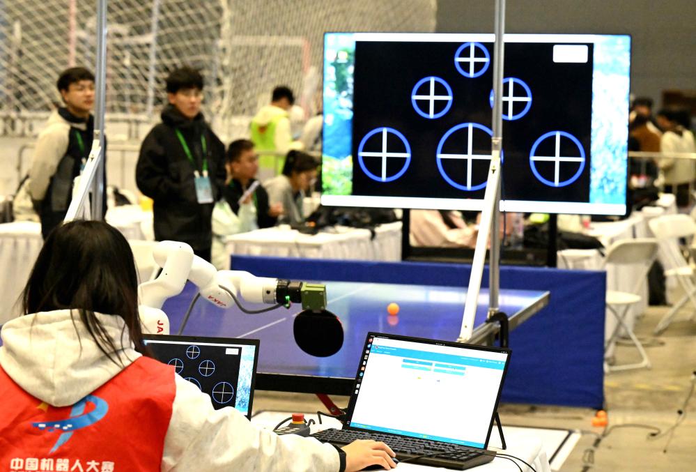 10月17日,乒乓球机器人在河北省石家庄国际会展中心进行比赛。