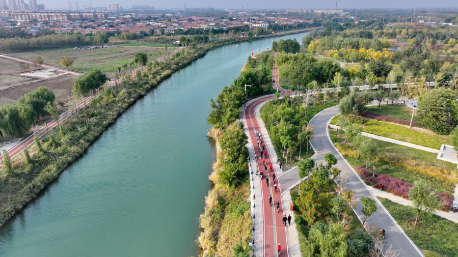 10月30日,市民在河北省沧州市运河区的大运河堤顶路上骑行。