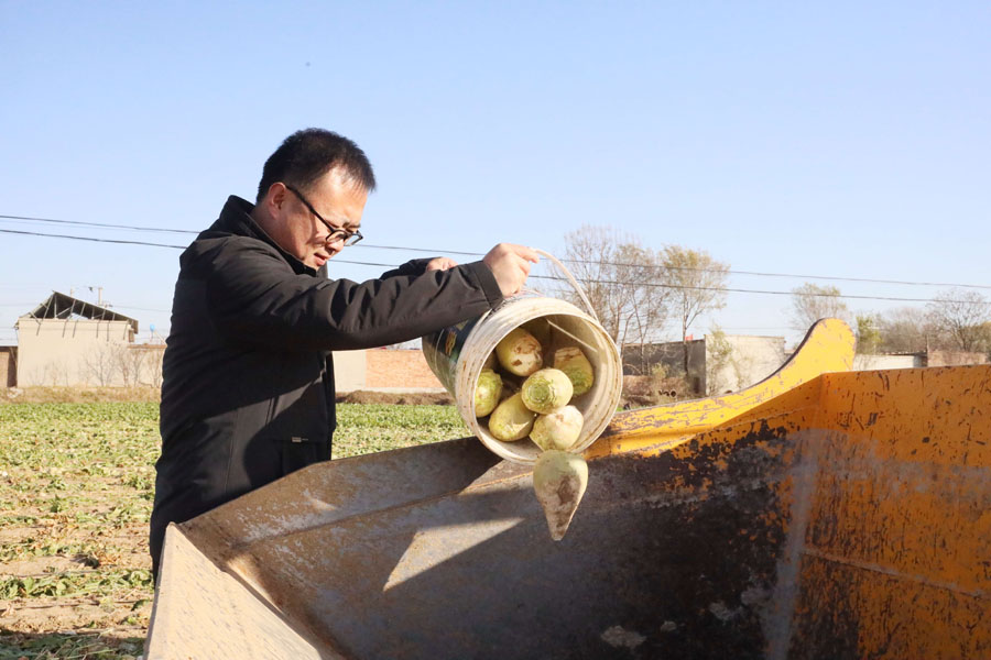 南宫市前尔家铺村农民将收获的芥菜装车。田优 摄