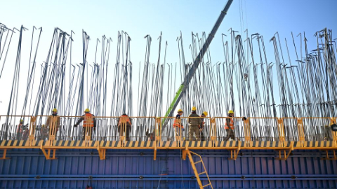 12月23日,中铁十一局工人在石雄铁路跨津石高速连续梁拱主墩建设现场架设钢筋。