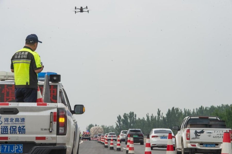 ↑河北高速集团京沪分公司工作人员在所辖高速利用无人机调查路况。(2025年7月25日 王晓健 摄)