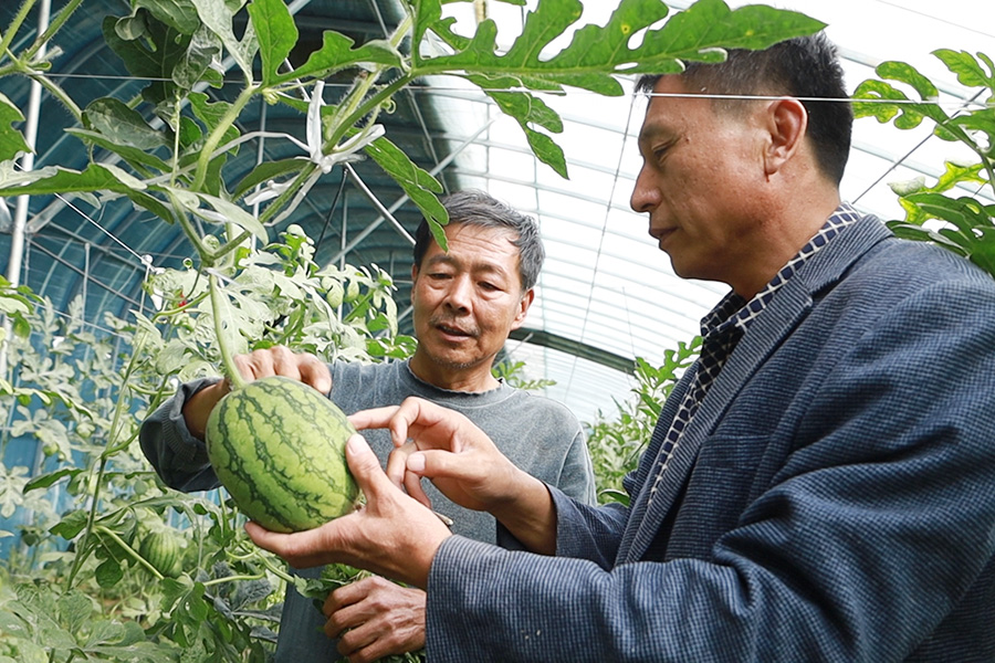 农技人员查看大棚内茴香生长情况。刘冲 摄