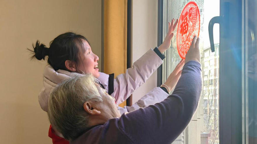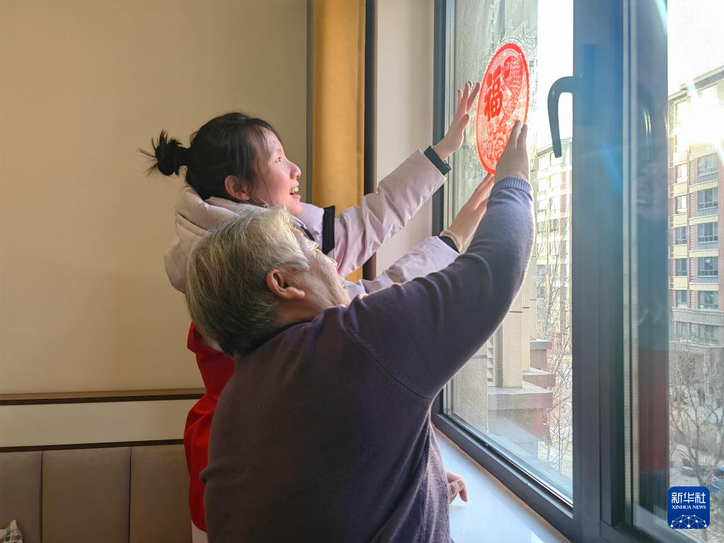 南文营社区工作者申彤欣来到独居老人马淑仙家中贴春联和福字。新华社记者 苏凯洋 摄