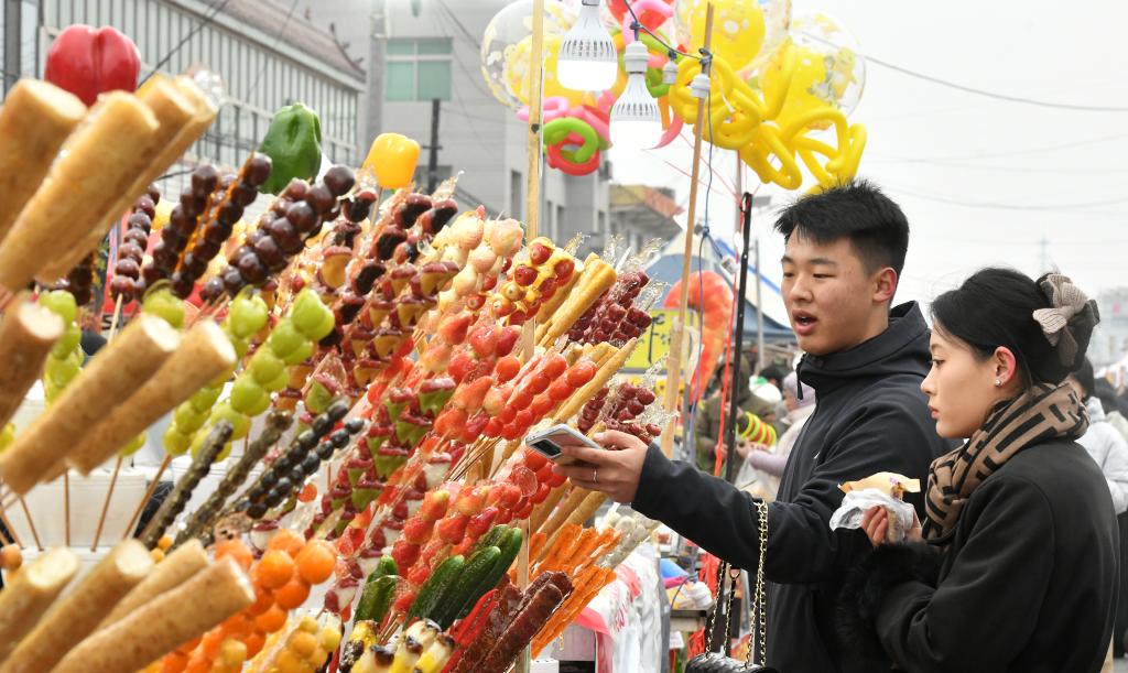 新华社石家庄3月4日电(记者苏凯洋、龚璟璐)正月十五,燕赵大地寒意未消。早上九点钟,河北沧州任丘市吕公堡镇后李花村已是十分热闹,数万名游客齐聚这里的“糖墩会”,品尝酸甜可口的糖墩儿,欣赏民俗表演,在传统文化习俗中感受节日氛围。
