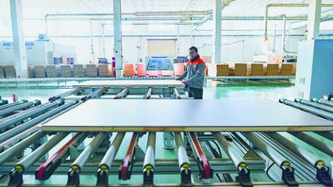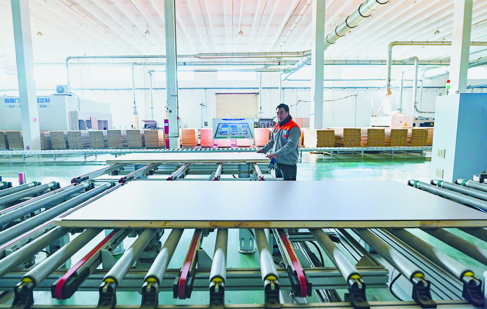 在河北智享门业智能制造有限公司共享制造车间,工人加紧赶制木门产品。