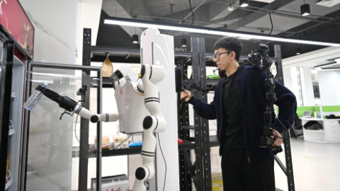 3月17日,在中国雄安集团数字城市科技有限公司具身智能训练场,工作人员采集机器人训练数据。