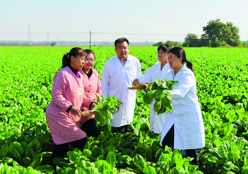 在石家庄市元氏县南因镇南因庄村的一片菊苣种植地里,农学专家们现场授课。(资料图片)记者 董永博 摄