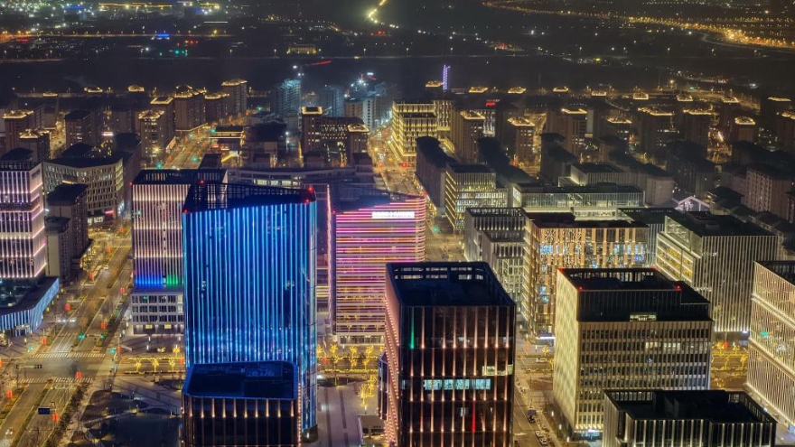 雄安新区商务服务中心片区夜景(3月16日摄,无人机照片)。新华社记者杨世尧 摄