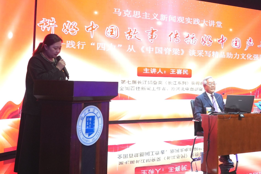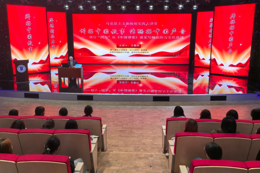 4月9日,河北师范大学新闻传播学院演播厅春潮涌动、掌声不断。来自新闻传播学院的学子,正在聆听中国优秀新闻工作者最高奖“长江韬奋奖”获得者王喜民讲述长城故事,主题是:讲好中国故事 传播好中国声音——践行“四力”从《中国脊梁》谈采写精品 助力文化强国。这是开学后“马克思主义新闻观实践大讲堂”的重点活动。