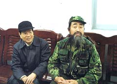 个人探险家张金星(右)向新华网记者江山出示男“野人”的脚印模型。(新华网甘肃频道记者冯诚摄) |
